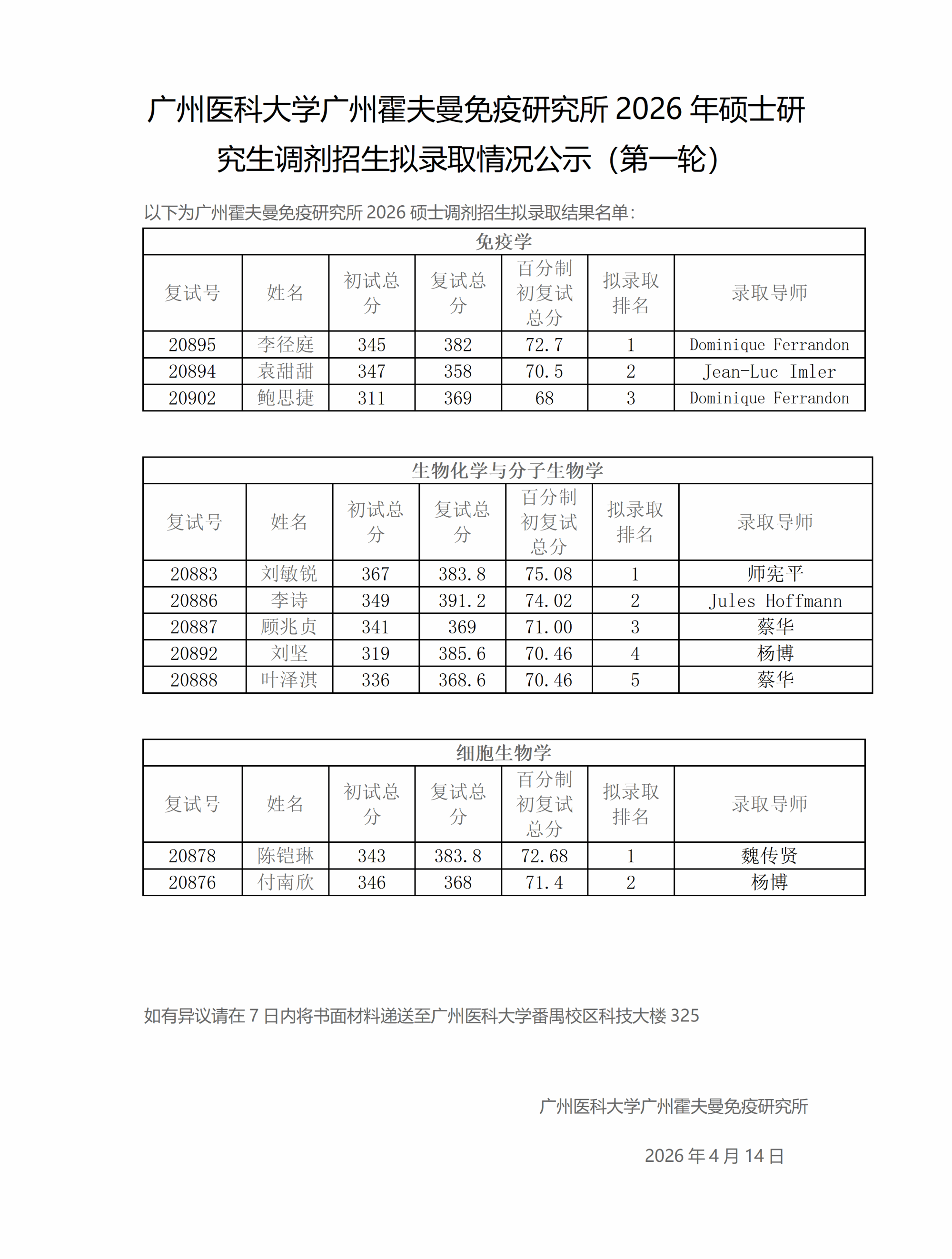 广州医科大学广州霍夫曼免疫研究所2026年硕士研究生调剂招生拟录取情况公示(第一轮)